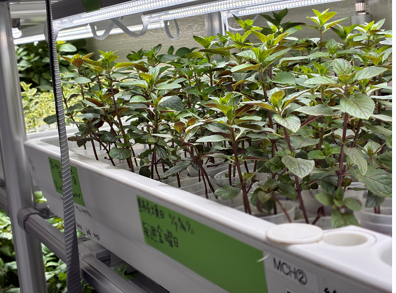 農園では、スペアミント、ペパーミント、レモンバーム、アップルミント、オレンジミント、パイナップルミントといった6種のハーブに加え、赤しそ、バジル、レタス、ローズマリー、水菜などの無農薬野菜も栽培しています。栽培はレカトン(レンガを砕いた土)を用いた育成、収穫・乾燥・加工・包装まで行っており、虫の発生を防ぐため、花や実がつく植物は避けるなどのルールも整備しています。また、食品営業届の取得により品質管理体制も確立しており、社内外へ安心して提供できる環境を整えています。